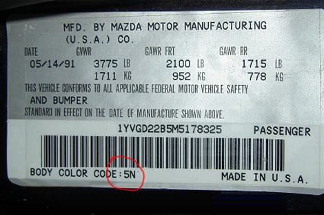 En los vehículos Mazda, la etiqueta con la información del color puede estar ubicada en varios puntos distintos del coche, como se señala en la imagen de referencia, donde el código aparece destacado en rojo.