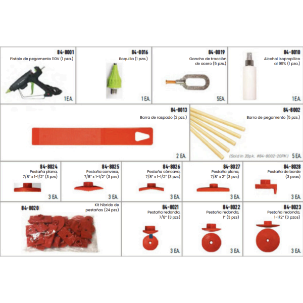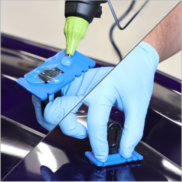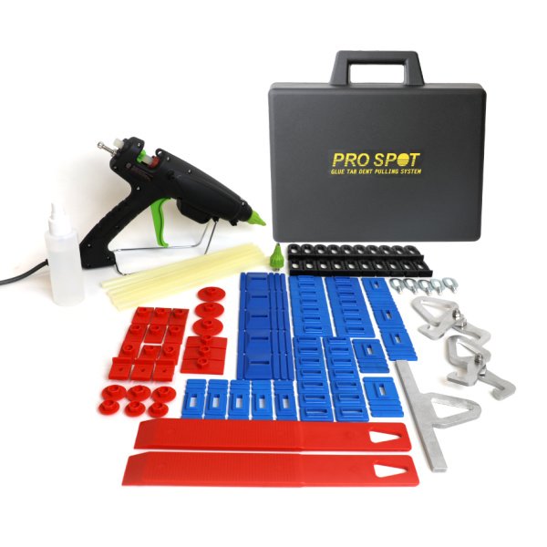 Reparar abolladuras ahora es más fácil con otra innovación de Pro Spot. Repare abolladuras importantes sin aplicar calor. Esto es crucial al reparar materiales nuevos, avanzados y sensibles al calor, como acero HS y aluminio. Estos materiales requieren nuevos procesos para repararlos con poco o ningún aporte de calor, y el kit de reparación de abolladuras Pro Spot con pegamento es la solución. Le ayudará con el proceso de reparación de abolladuras, reduciendo el tiempo de reparación al evitar la soldadura o los procedimientos de arco.