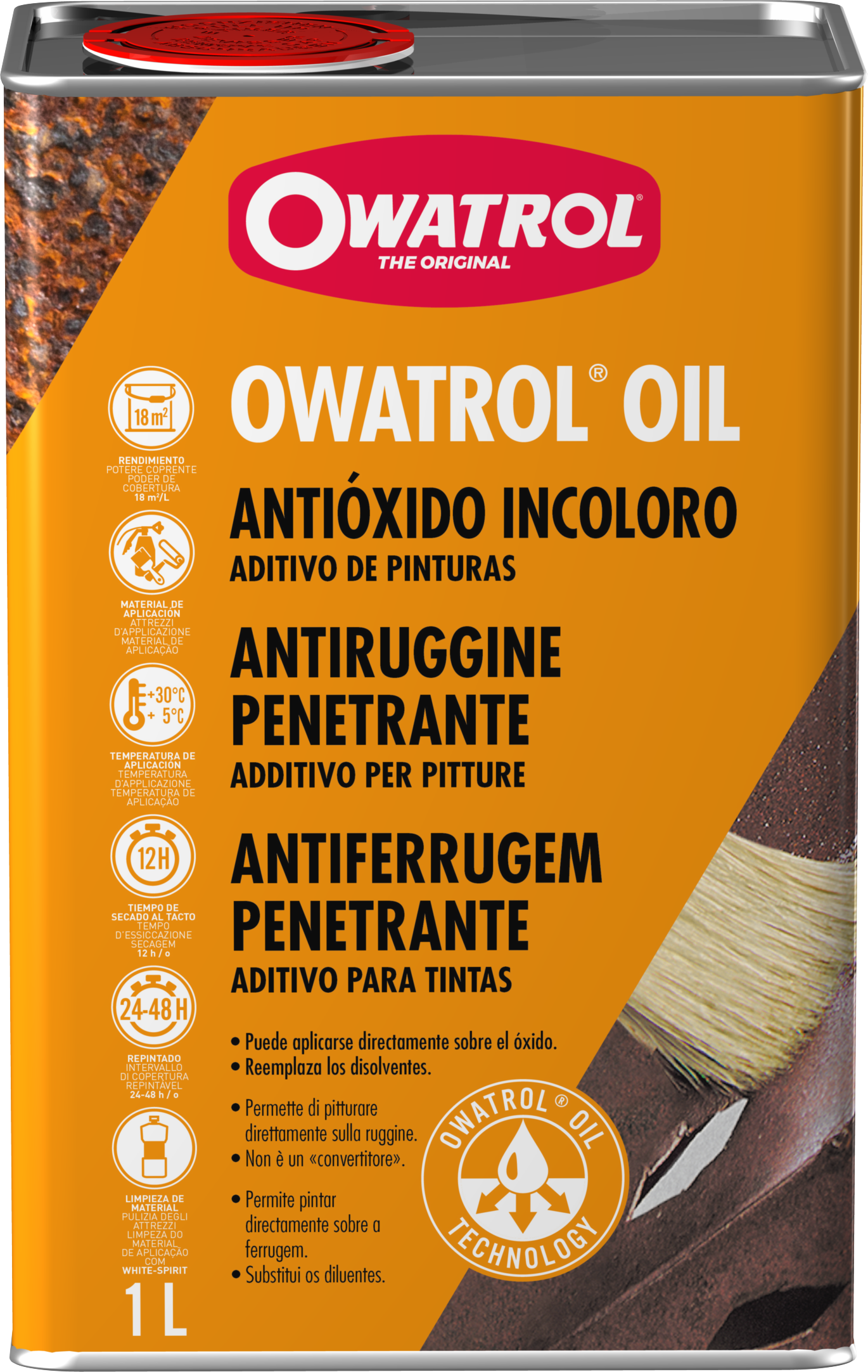 OWATROL® OIL. Este tratamiento antioxidante permite que sus materiales sean más resistentes, detiene la oxidación y los protege de las agresiones externas. Para ser utilizado como capa de base antes de la pintura de acabado, le garantiza un resultado de calidad y protege sus materiales del calor y la humedad gracias a su película protectora.